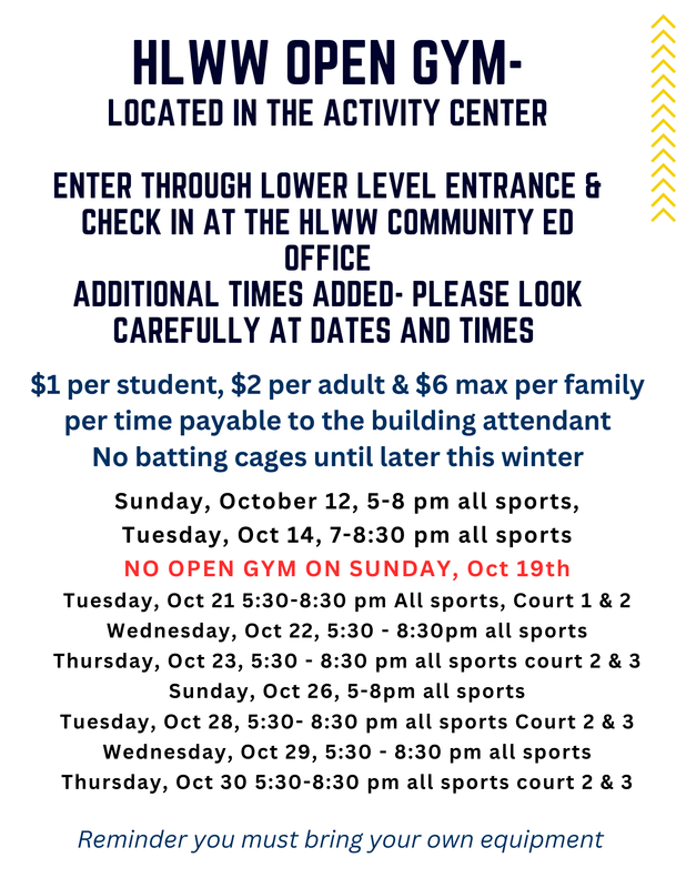 Students and Adults Bring your own equipment: basketball, volleyball, bat, softee balls, gloves, pickleball equipment. Youth grade 6 and under must be accompanied by an adult. Watch online for additional weekday dates and times.