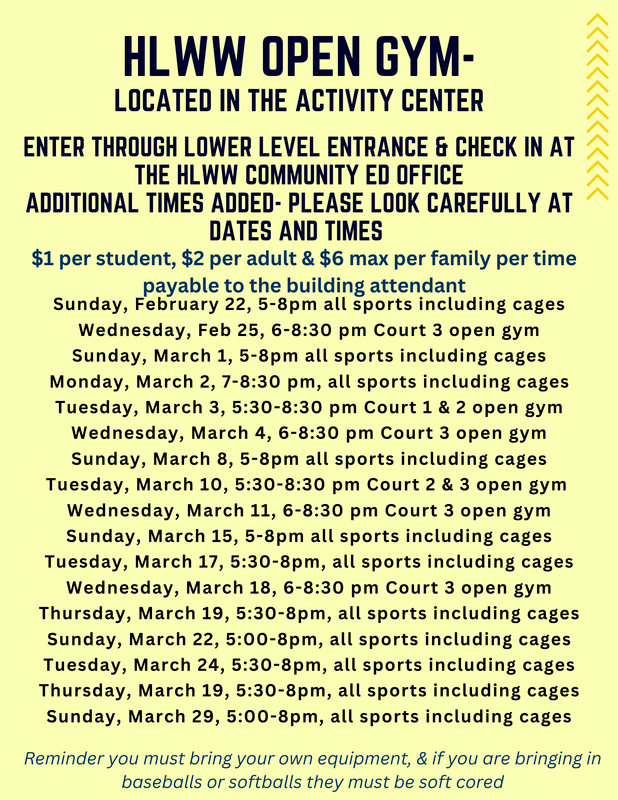 Sunday Night Open Gym Updates-Thank you for everyone who has come out to participate in Sunday Night Open Gyms. It has been well attended!!** Batting Cages- -Will be accessible from 5-7:30 pm-Reminder this is NOT for teams to practice-Please rotate through to let everyone who wants to use the batting cages an opportunity -Must bring your own equipment, and use soft core balls**Overflow if Needed--If available & needed, at 6:30pm we can rotate some basketball players upstairs to the high school gym